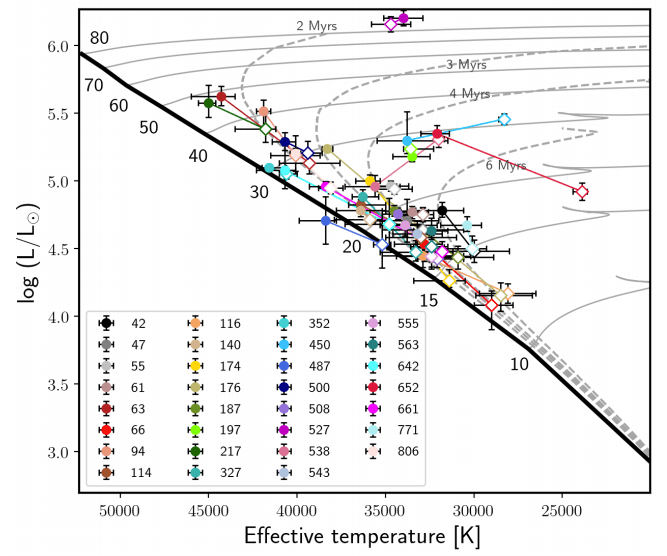 Methods: In the present paper, 32 epochs of FLAMES/GIRAFFE spectra are analysed by using spectral disentangling to construct the individual spectra of 62 components. We then apply the CMFGEN atmosphere code to determine their stellar parameters and their helium, carbon, and nitrogen surface abundances.
